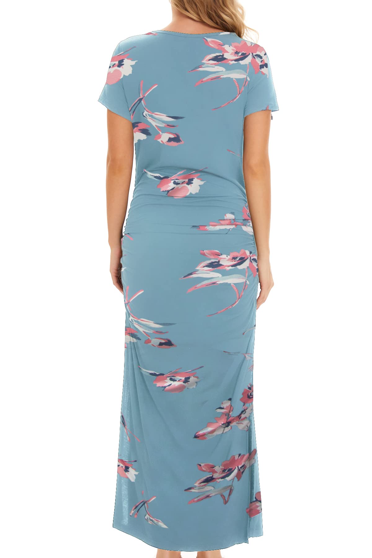 - Round neck short sleeve maternity dress with two side ruched and split designed to be elegant and stylish,it shows off your curves during all stages of pregnancy, flattering cut that elongates your silhouette ,helps you stand out even during pregnancy!